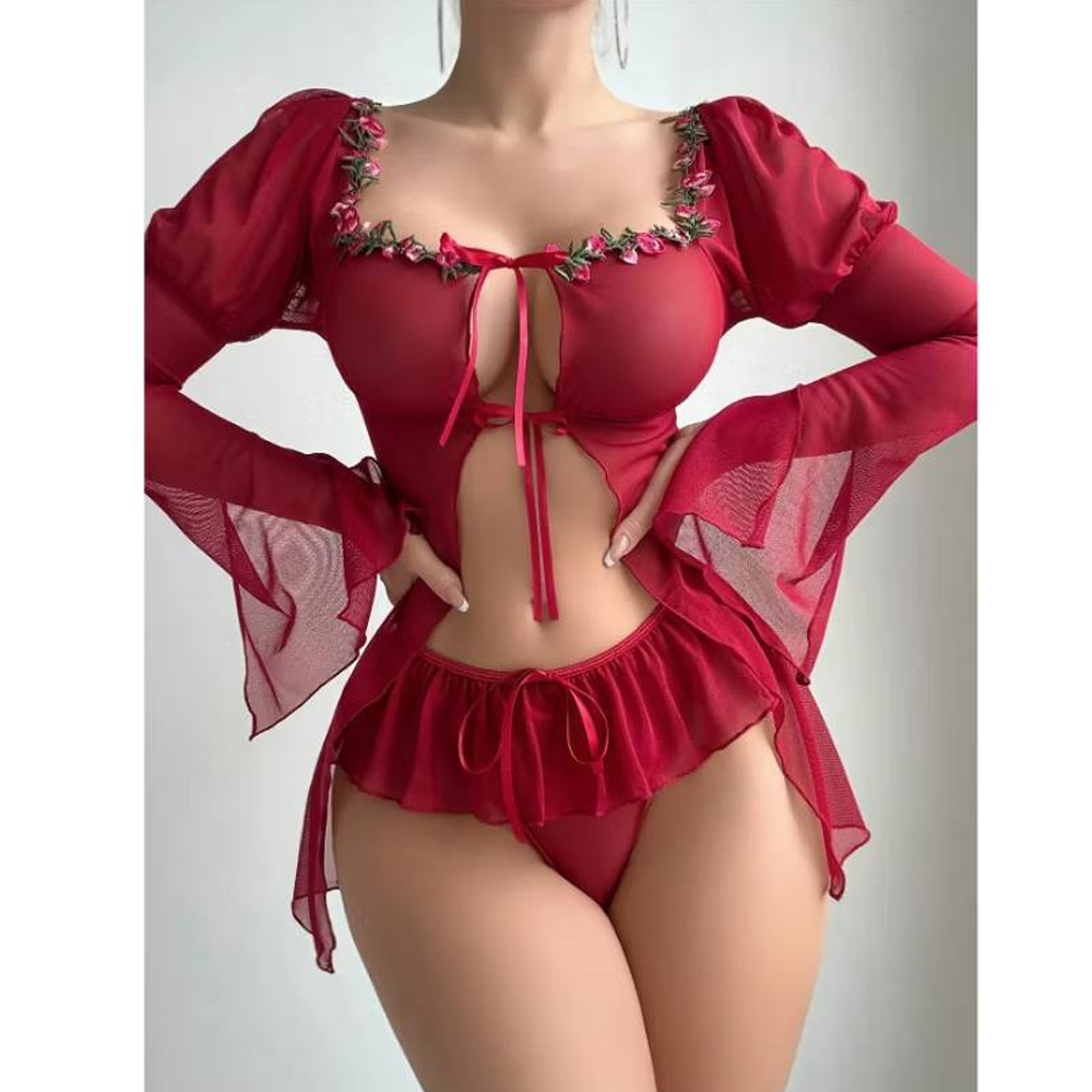 Unleash your inner romantic with this stunning 2-piece sheer mesh lingerie set. Featuring intricate rose embroidery along a square neckline and an elegant open-front tie design, this set combines the sophistication of long, flared sleeves with the playful charm of a ruffled, ribbon-tie panty. Perfect for special evenings where you want to feel effortlessly beautiful.